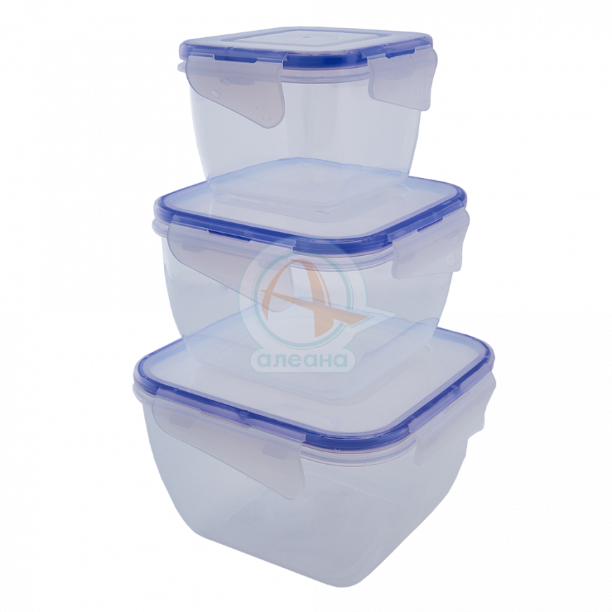 Универсалните контейнери с щипки са подходящи за съхранение на хранителни продукти. Четиристранното закопчаване на капака осигурява херметичност на контейнера. Серията включва 3 контейнера с квадратна форма, размери: - 0,45 л - 0,9 л - 1,5 л. Формата на контейнерите е квадратна. Материалът е полипропилен. Не съдържа токсини и не реагира с храната.